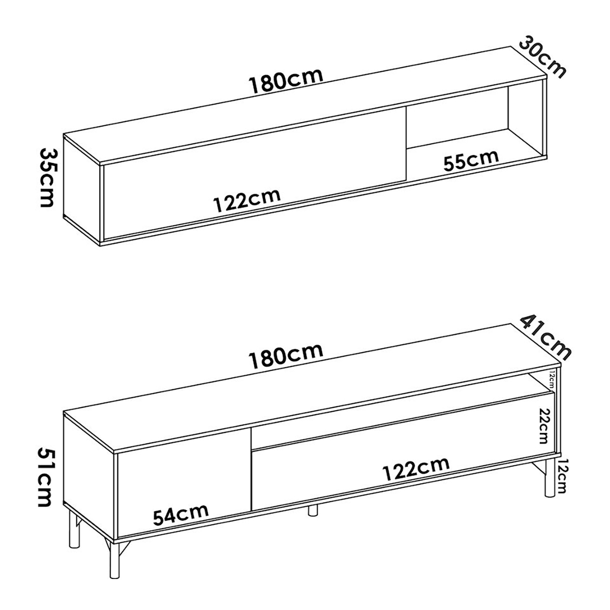 – Meuble bas : L180 x P41 x H51cm – 2 portes